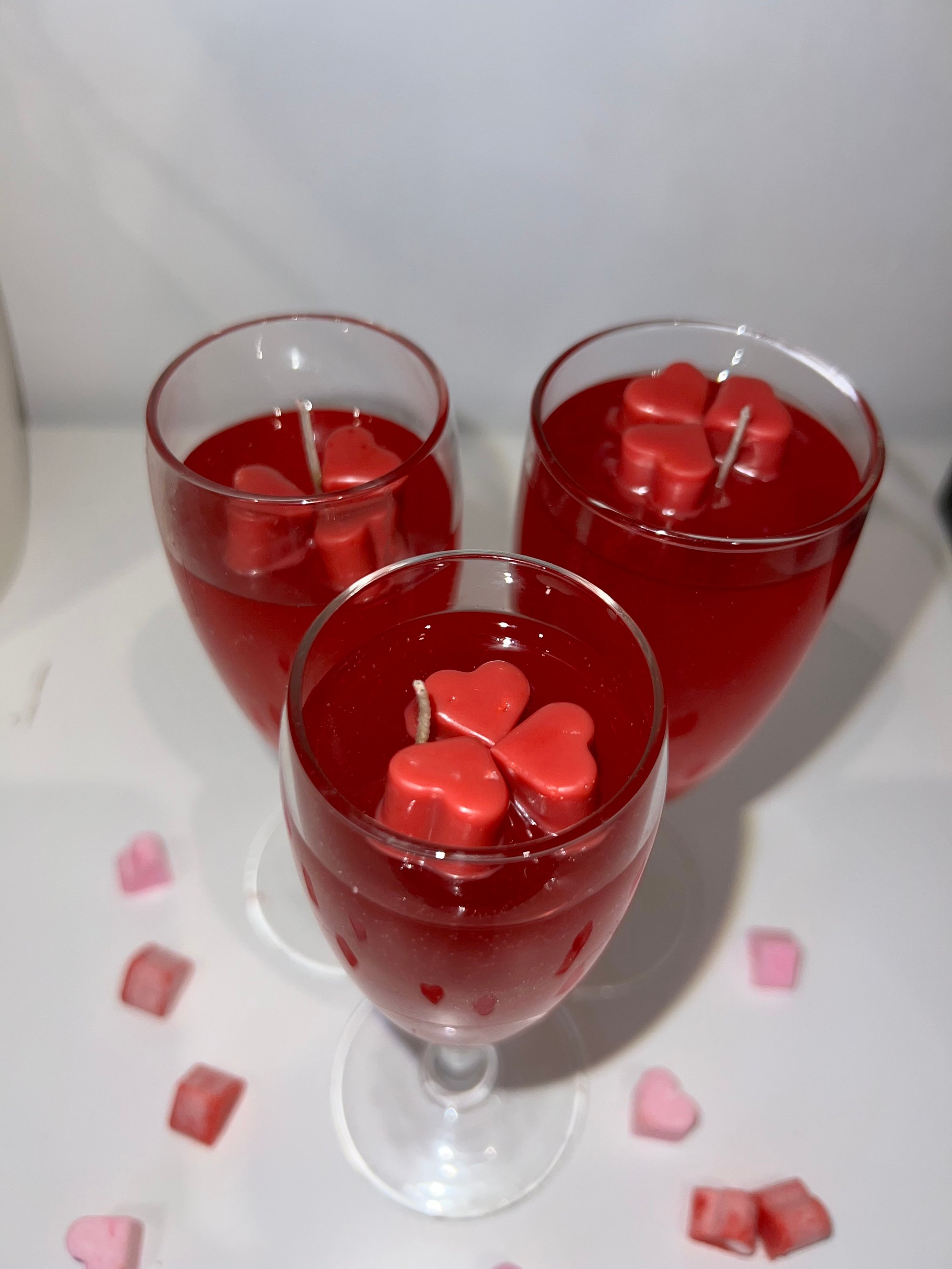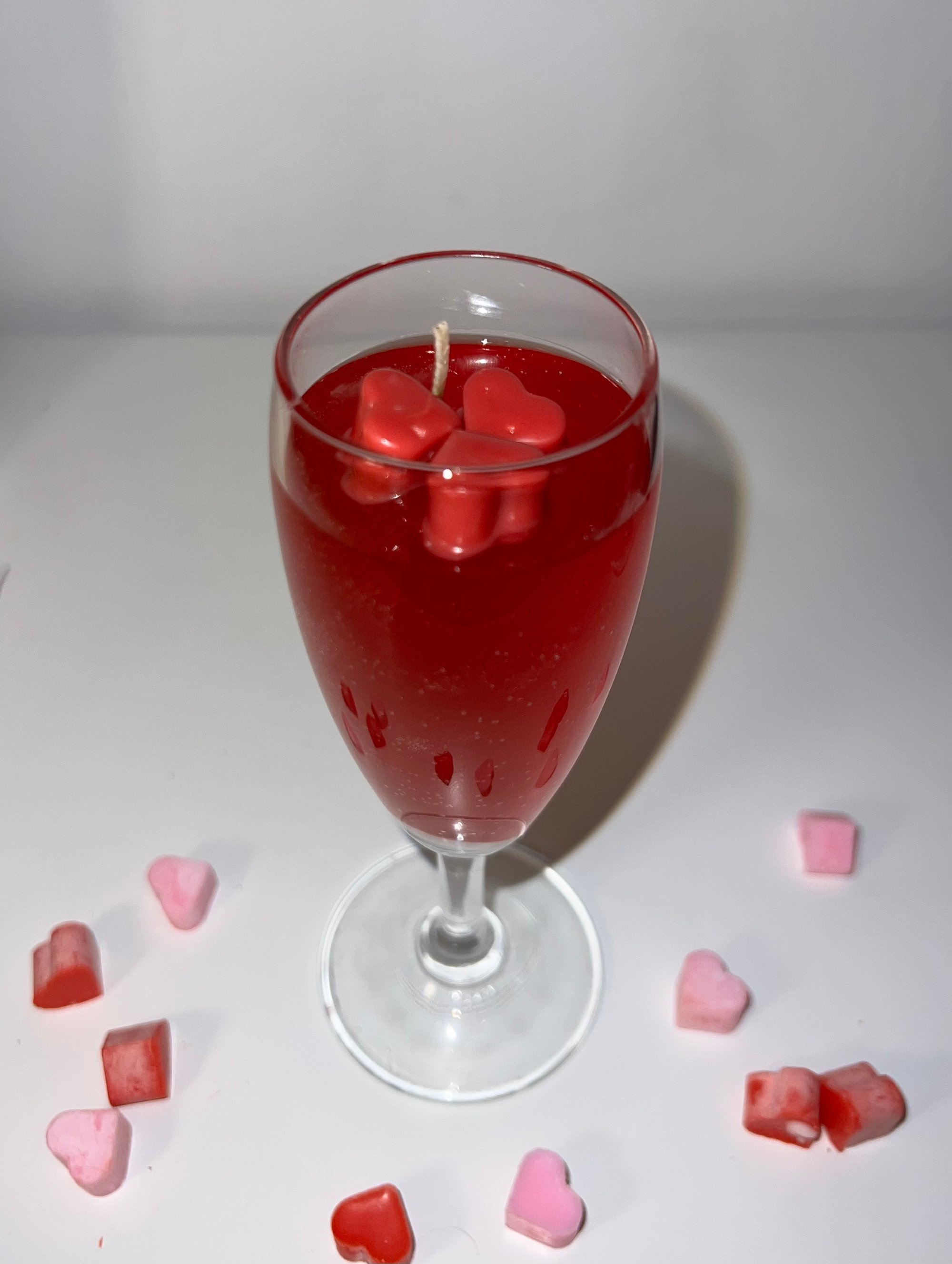 Handgegossen in ein edles Sektglas verzaubert sie nicht nur durch ihren Duft, sondern auch durch ihr Design. Tiefrotes Jellywachs mit roten Herzen on top macht sie zu einem echten Statement Piece und zum perfekten Geschenk für den Valentinstag. 🍷